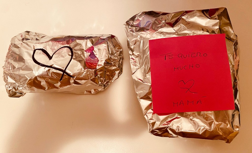 Me presioné mucho y aún lo hago por no darle lo mismo a mis dos hijas pero la vida poco a poco me enseña que no puedo cargar con eso en mi mochila. Cada una recibe y recibirá lo que necesita de mí pero aún así aunque no pueda acompañar a mis pequeñas campanillas a su cole al menos ven preparar cada mañana con unas manos llenas de amor su almuerzo y sé que ese dibujo imperfecto en el envoltorio o esa letra torcida en ese post-it hacen que entiendan que estoy muy cerca aunque no esté presente. Probablemente sea mi corazón el que necesite sentirse reconfortado y en paz.